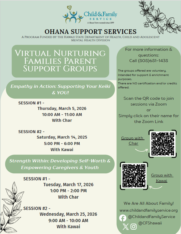 FreeOhana Support Services, a program of Child and Family Services, invites you to join their virtual Nurturing Families Parent Support Groups in March.