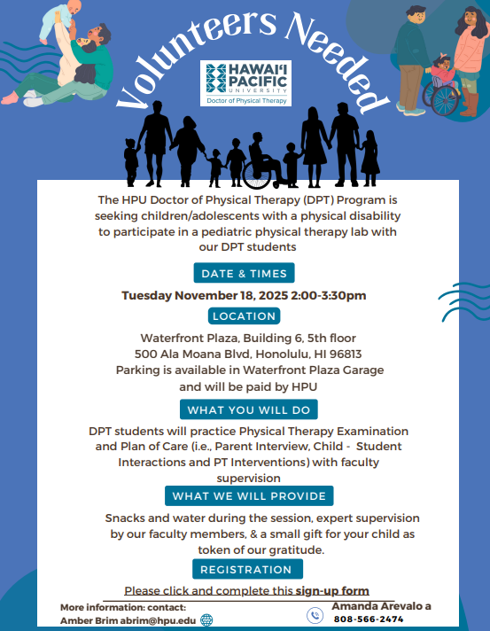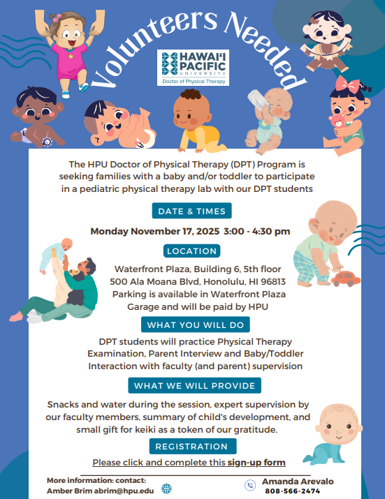 FreeHPU is inviting children to participate in a special pediatric physical therapy lab hosted by the Doctor of Physical Therapy (DPT) program at Hawai’i Pacific University.