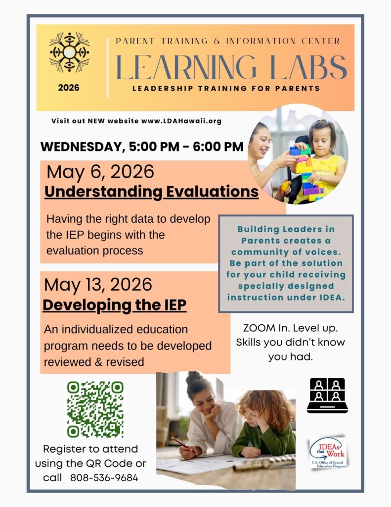 Please join LDAH – Leadership in Disabilities and Achievement Hawaii – for our Learning Labs.  Building Leaders in Parents creates a community of voices. Be part of the solution for your child receiving specially designed instruction under IDEA