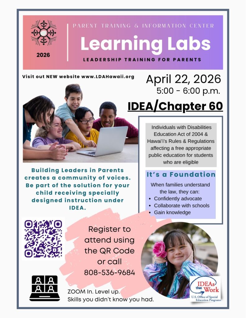 FreePlease join LDAH – Leadership in Disabilities and Achievement Hawaii – for our Learning Labs. Building Leaders in Parents creates a community of voices. Be part of the solution for your child receiving specially designed instruction under IDEA