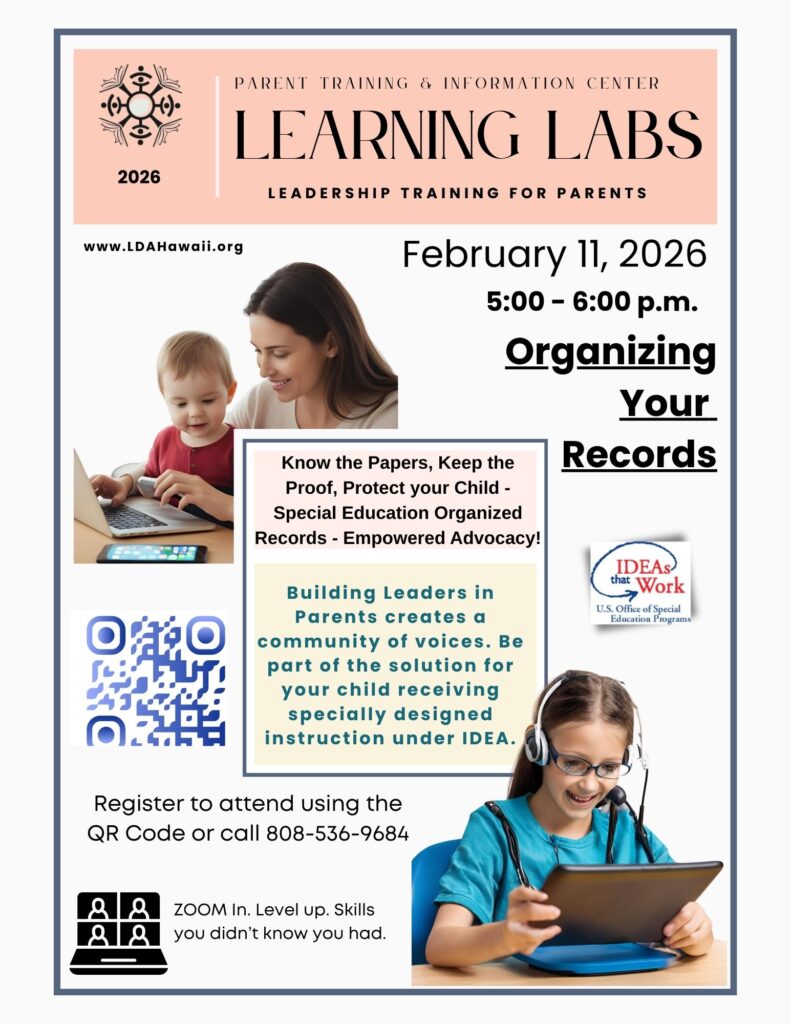 Please join LDAH – Leadership in Disabilities and Achievement Hawaii – for our Learning Labs.  Building Leaders in Parents creates a community of voices. Be part of the solution for your child receiving specially designed instruction under IDEA