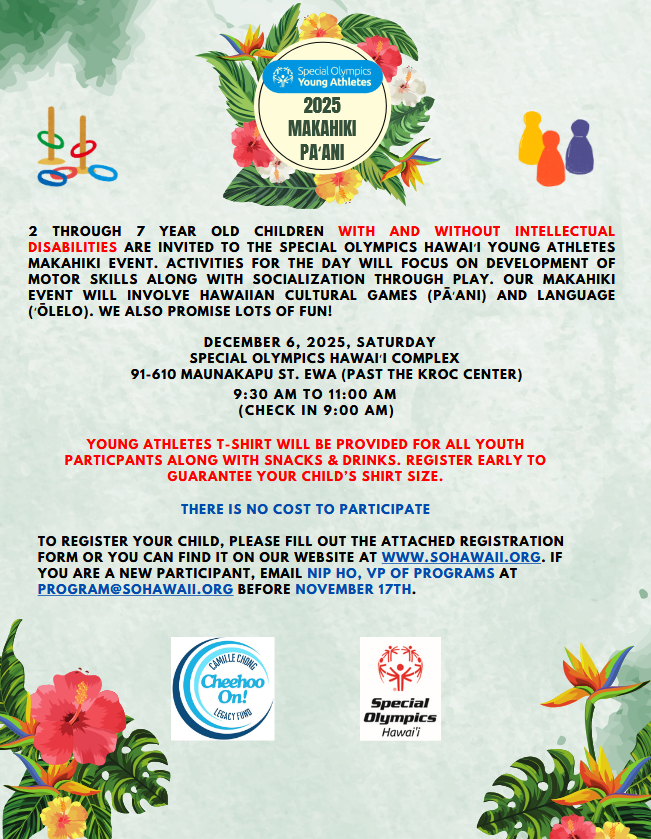 For the registration form, visit the Special Olympics Hawaii website is https://sohawaii.org/initiatives/young-athletes/