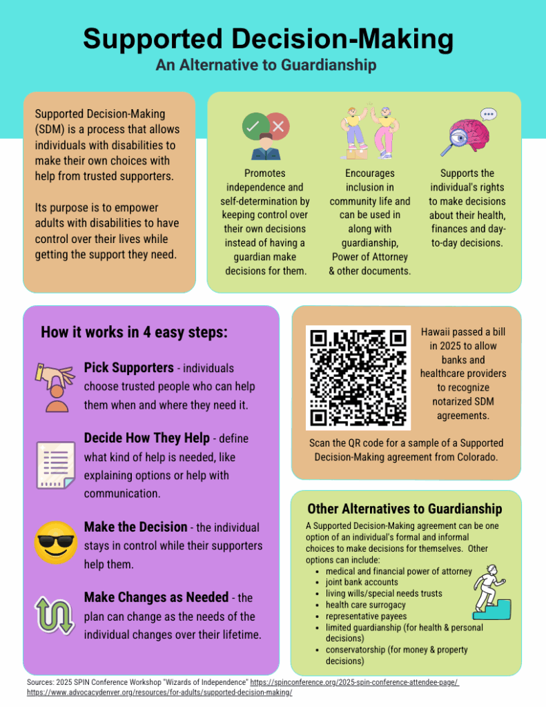 One alternative to guardianship is Supported Decision-Making (SDM), which is an empowering alternative to guardianship that enables individuals with disabilities to make their own decisions with the support of trusted people in their lives, such as family members, friends, or professionals. Through SDM, individuals maintain their legal rights while receiving the guidance and assistance they need to understand, consider, and communicate their choices. If you are interested in learning more about how to implement Supported Decision-Making or need guidance on how to get started, please contact Julia Althoff at the Hawaii State Council on Developmental Disabilities at julia.althoff@doh.hawaii.gov or 808-798-1501 for more details.